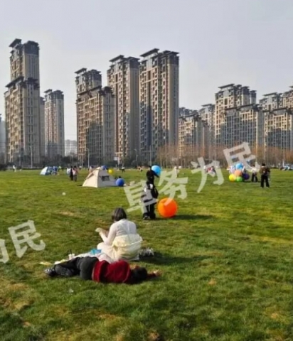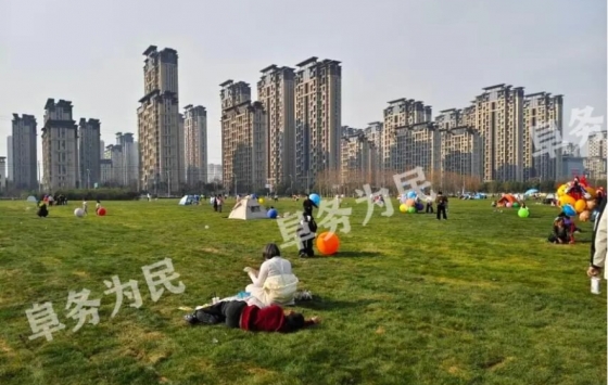 近日,颍东岳家湖西侧新出现了一片数万平方米的大草坪,吸引众多附近居民前来休闲打